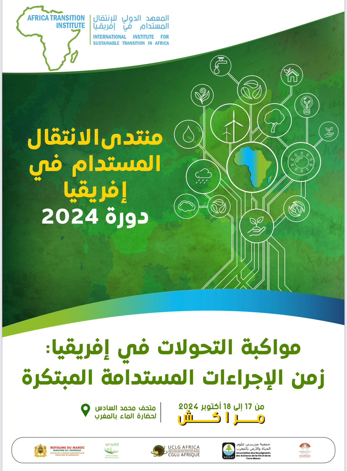 ولإطلاق أنشطته، يشرف المعهد أن يعلن عن تنظيم النسخة الأولى من منتدى الانتقال الإفريقي 2024 (Africa Transition Forum ATF ). بحيث سيُعقد هذا المنتدى الرفيع المستوى تحت شعار “مواكبة التحولات في إفريقيا: زمن الإجراءات المستدامة المبتكرة”، يومي 17 و 18 أكتوبر 2024 في متحف محمد السادس لحضارة ماء المغرب بمراكش.