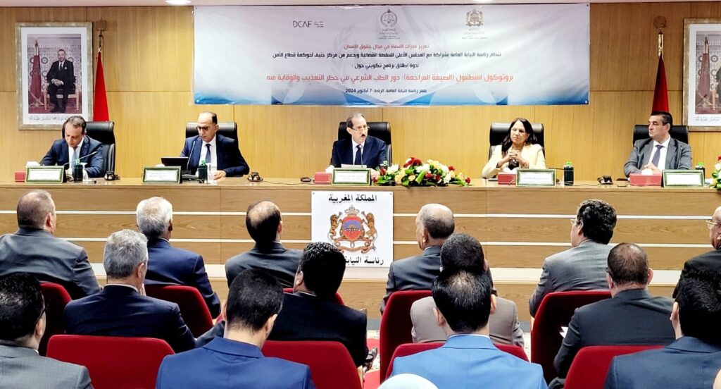 ألقى الوكيل العام للملك لدى محكمة النقض رئيس النيابة العامة، الأستاذ مولاي الحسن الداكي، يوم الاثنين 7 أكتوبر، كلمة في افتتاح أشغال ندوة إطلاق برنامج تعزيز القدرات في مجال استخدام أدلة الطب الشرعي في التحري والتحقيق في ادعاءات التعذيب طبقا لبرتوكول إسطنبول في صيغته المراجعة، المنظمة من طرف رئاسة النيابة العامة بشراكة مع المجلس الأعلى للسلطة القضائية وبتعاون من مركز جنيف لحوكمة قطاع الأمن.